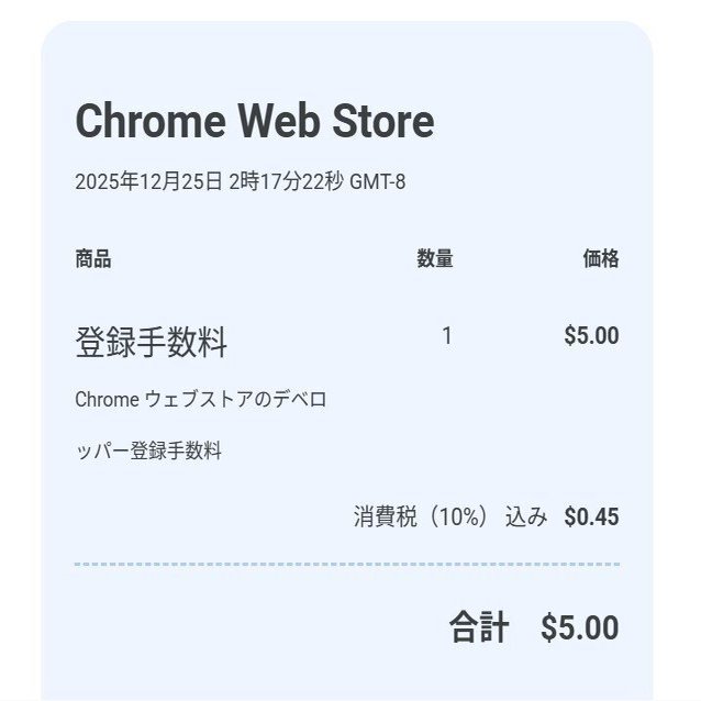 開発した拡張機能をChromeウエブストアで公開する際には、デベロッパー登録として5ドルの支払いが必要です。